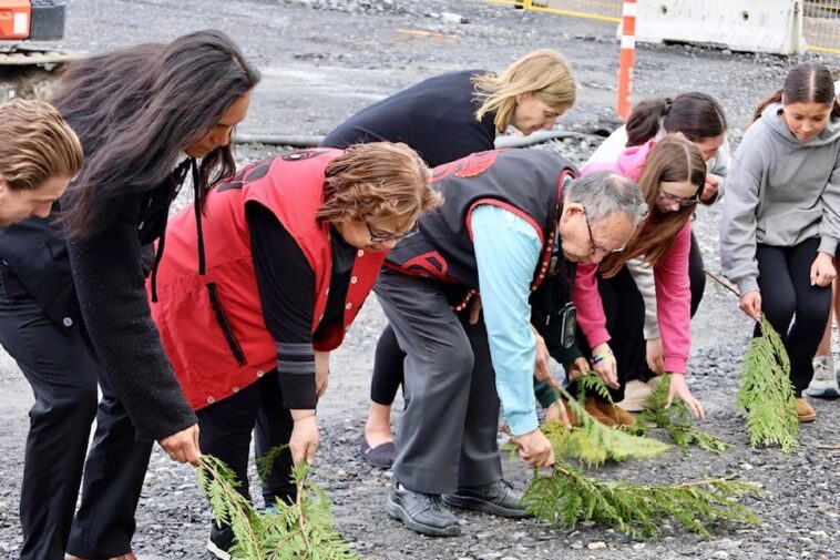 Sm’ooygit Githoon (Alex Campbell) led the traditional blessing ceremony at the construction spot, and various stakeholders participated in a symbolic gravel scoop marked with a golden shovel.